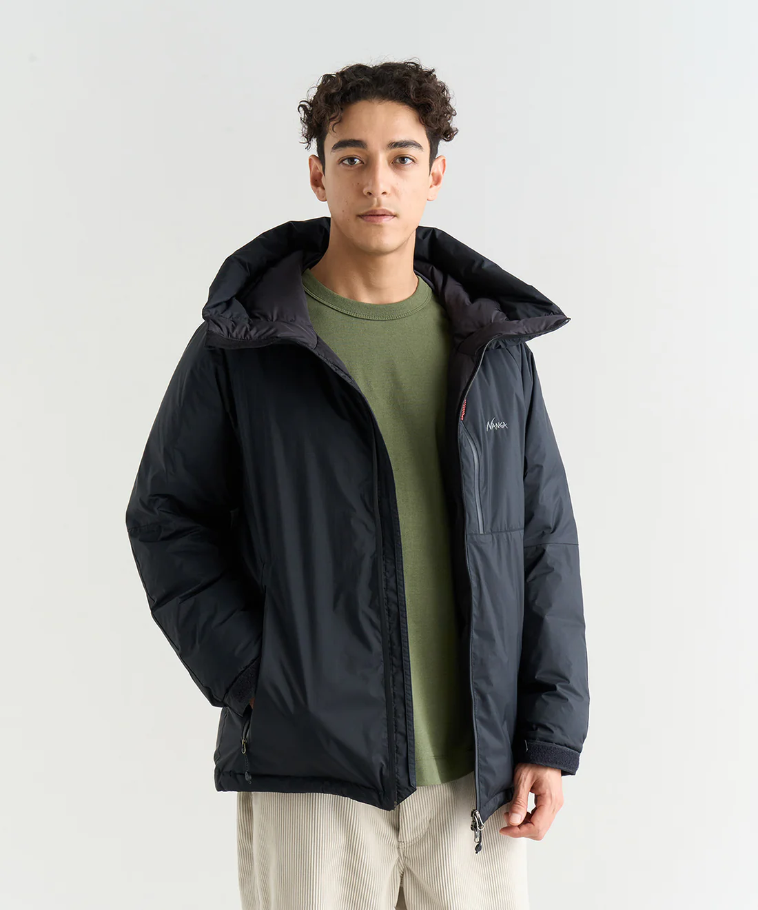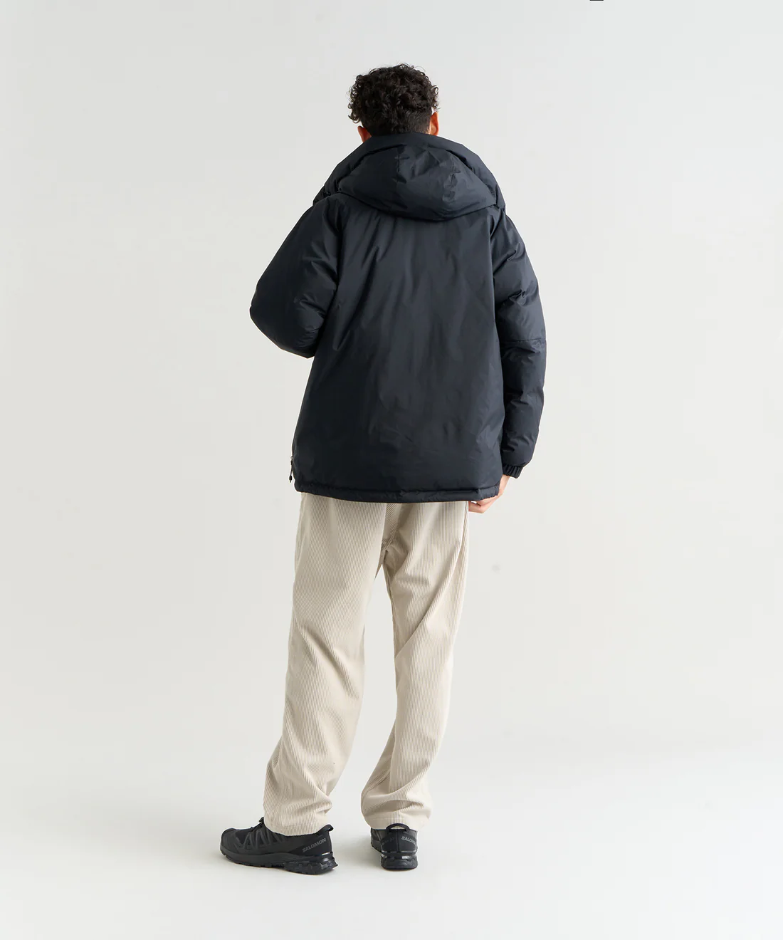 ネックまで覆う高めのフードは首元を暖かくキープし、ドローコードで調整可能です。